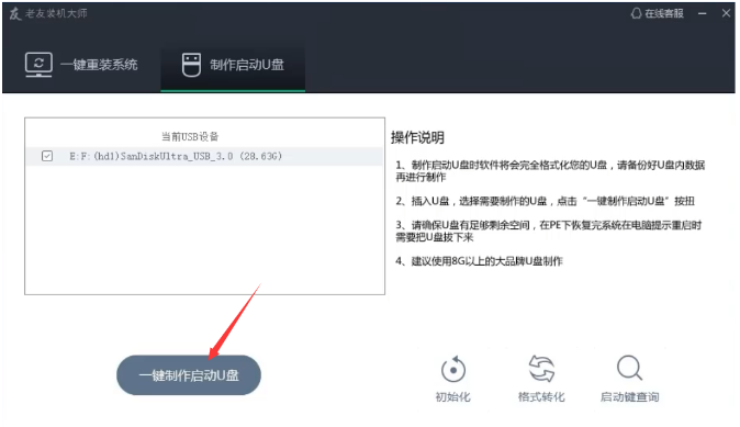 1、首先,打開老友裝機大師,開啟軟件,選擇制做啟動U盤,點擊“一鍵制做啟動u盤”。