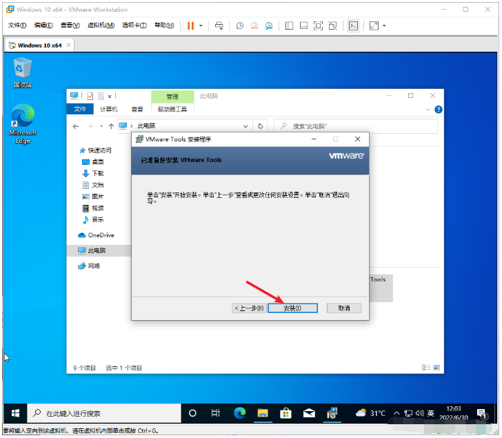 1、選擇打開win10虛擬機,點擊安裝VMware Tools。