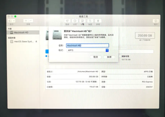 4、這時會彈出提示要抹掉“mac os”嗎?注意這里磁盤格式一定要選擇APFS格式,否則其它的磁盤格式會對某些軟件的安裝庫不兼容,如:Adobe的pkg格式等。