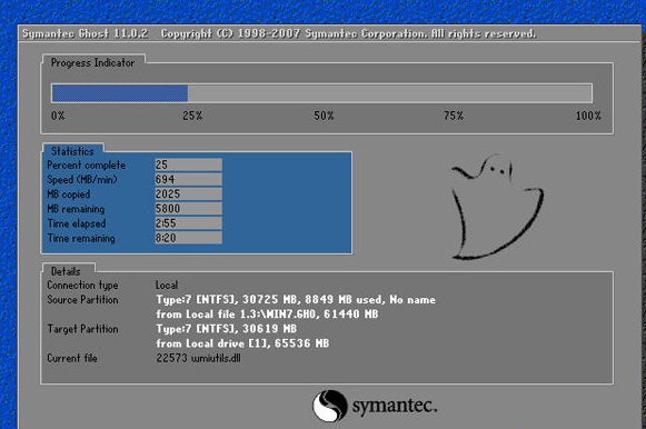 5、這時候電腦會重啟操作,重啟進入開機啟動項頁面時多出Onekey Ghost選項,系統會默認自動選擇Onekey Ghost進入安裝過程當中。