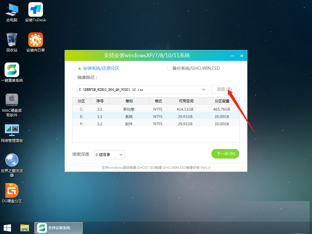 8、打開工具后,點擊瀏覽選擇U盤中的下載好的系統鏡像ISO。