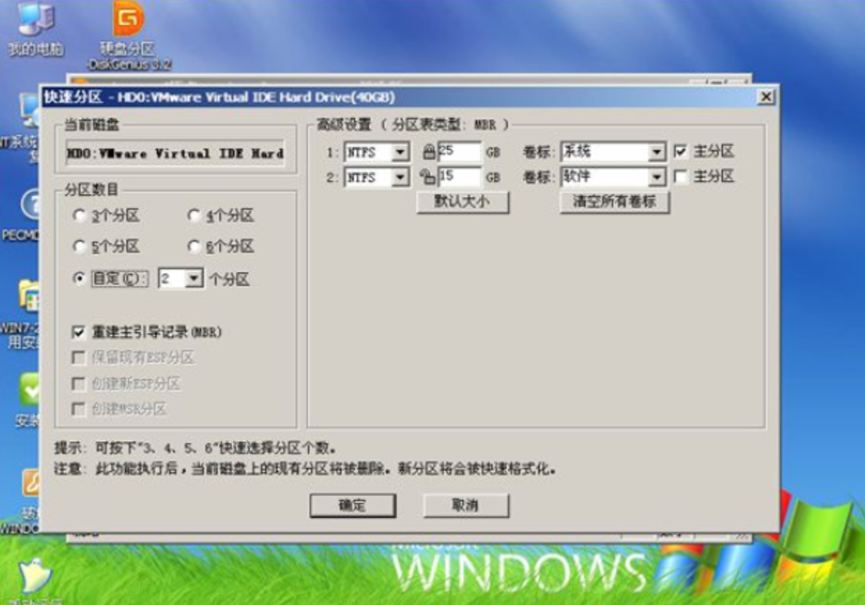 4、在快速分區界面下,設置分區數目和每個分區的大小,點擊確定。