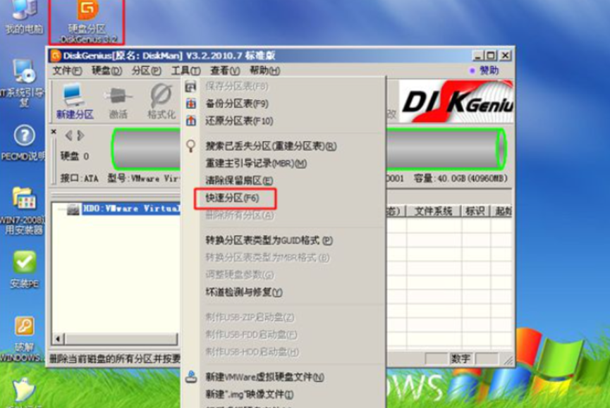 3、如果需要分區,雙擊PE桌面上的【硬盤分區DiskGenius】,右擊硬盤—快速分區,不需要分區的用戶可以直接執行第5步。