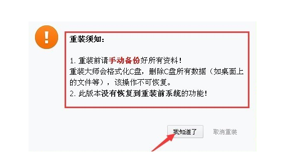 4、檢測完成后,界面上將彈出重新安裝說明,此處單擊“我知道”。