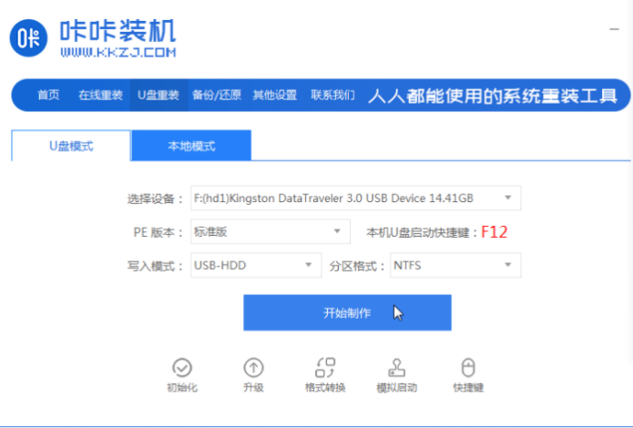 2,選擇U盤模式,鼠標點擊“開始制作”下一步。