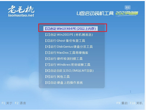 4、進入老毛桃winpe 主菜單后,我們選擇【1】Win10X64PE(2G以上內存)并回車。