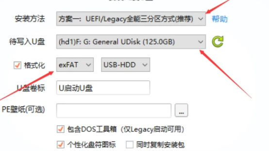 2.“安裝方法”點擊推薦的三分區方式。待寫入U盤就是剛剛插入的U盤。這里格式選擇【exFAT】。
