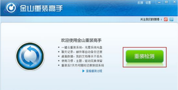 1、下載金山重裝高手,點擊主界面的[重裝檢測]大按鈕,等待系統環境檢測。該工具無需系統光盤,一鍵重裝系統;自動備份/還原重要數據,并且全面支持win xp和win7。