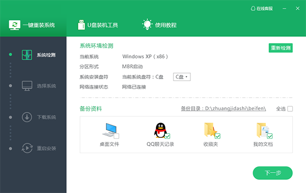 下載軟件完軟件后正常打開(“小黑一鍵重裝系統”), 程序會默認檢測當前系統環境,檢測完成后,點擊“下一步”。