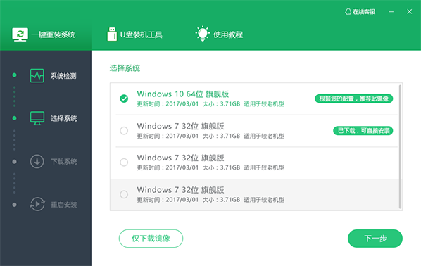 小黑一鍵重裝系統已為您推薦適合電腦配置的系統版本,用戶也可選擇XP,Win7或Win10,點擊“下一步”。