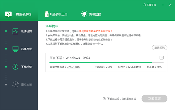 到了這一步時用戶即可離開電腦,程序會全自動完成重裝步驟。為防止出現安裝失敗,用戶也可以選擇“制作啟動U盤”進行U盤裝機。