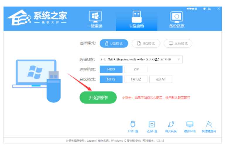 1、首先打開系統之家,選擇【U盤啟動】,默認格式,點擊開始制作。