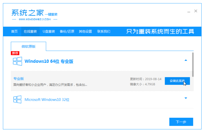 2、首先把殺毒軟件關閉避免出現攔截。打開系統之家,點擊在線重裝,找到自己需要下載安裝的系統。