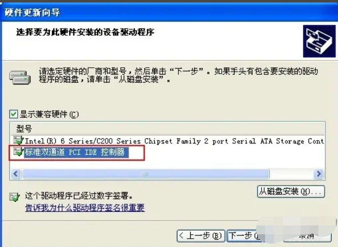 6、在“顯示兼容硬件”對話框中選擇“標準雙通道 PCI IDE 控制器”,然后下一步,完成該步驟,有多個主板驅動選項都如此進行操作。