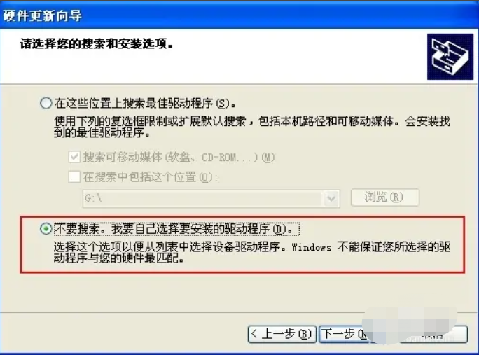 5、在出來的“硬件更新向導”對話框中,搜索軟件選擇“否,暫時不”然后點擊下一步,選擇“從列表或指定位置安裝”,接著選擇“不要搜索。我要自己選擇要安裝的驅動程序”。