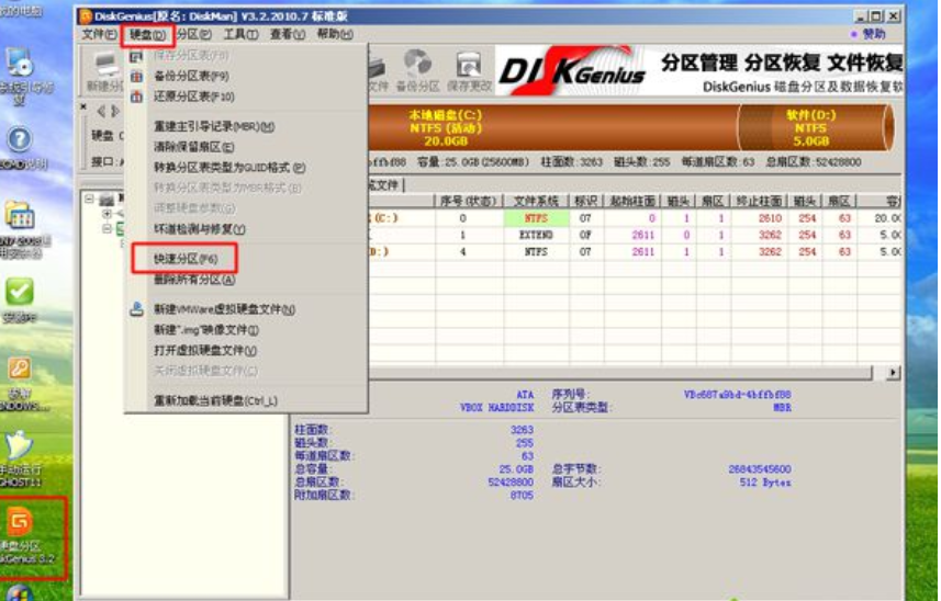 3、如果需要全盤重新分區,雙擊【硬盤分區DiskGenius】,點擊【硬盤】—【快速分區】。