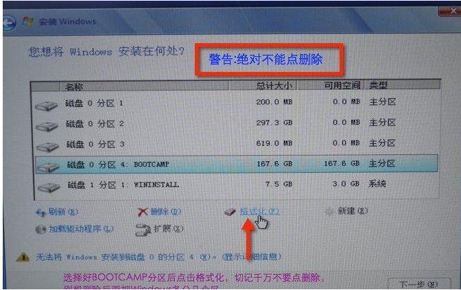7、選擇BOOTCAMP分區,再點擊驅動器選項(高級),選擇好BOOTCAMP分區后點擊格式化,切記千萬不要點刪除,別想刪除后再把Windows多分幾個區。