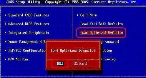 2、由于BIOS界面種類非常多,如果是如下圖的界面,選擇“Load Optimized Defaults”,按下回車鍵,選擇“ok”或者“yes”回車,再按F10保存退出。
