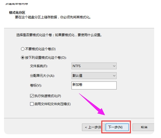 8、在這個界面中,為新建的簡單卷選擇磁盤的格式,一般默認選擇“NTFS”即可,繼續“下一步”。
