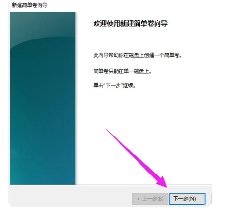 6、在新建簡單卷向導頁面中,點擊“下一步”。