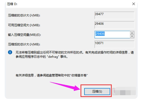 4、系統會計算出可以壓縮空間,輸入需要壓縮空間,然后點擊“壓縮”按鈕。