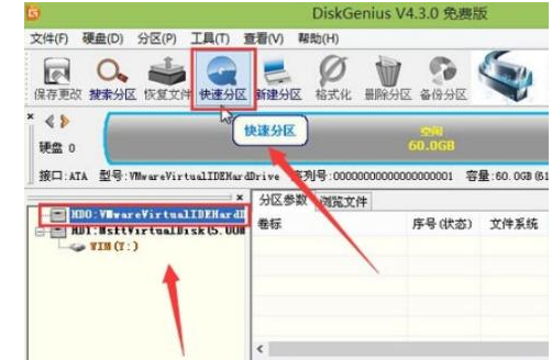 4、在打開的分區工具對話框中,選擇想要進行分區的硬盤,點擊“快速分區”然后進入下一步。