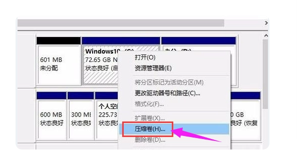 3、在窗口的右下邊可以看到磁盤,選中要分區的磁盤點擊鼠標右鍵,選擇“壓縮卷”。
