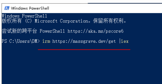 3、之后輸入 irm https://massgrave.dev/get |iex 然后按下回車,會自動下載激活腳本并運行。