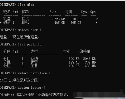 ④輸入 assign letter=J(分配盤符)