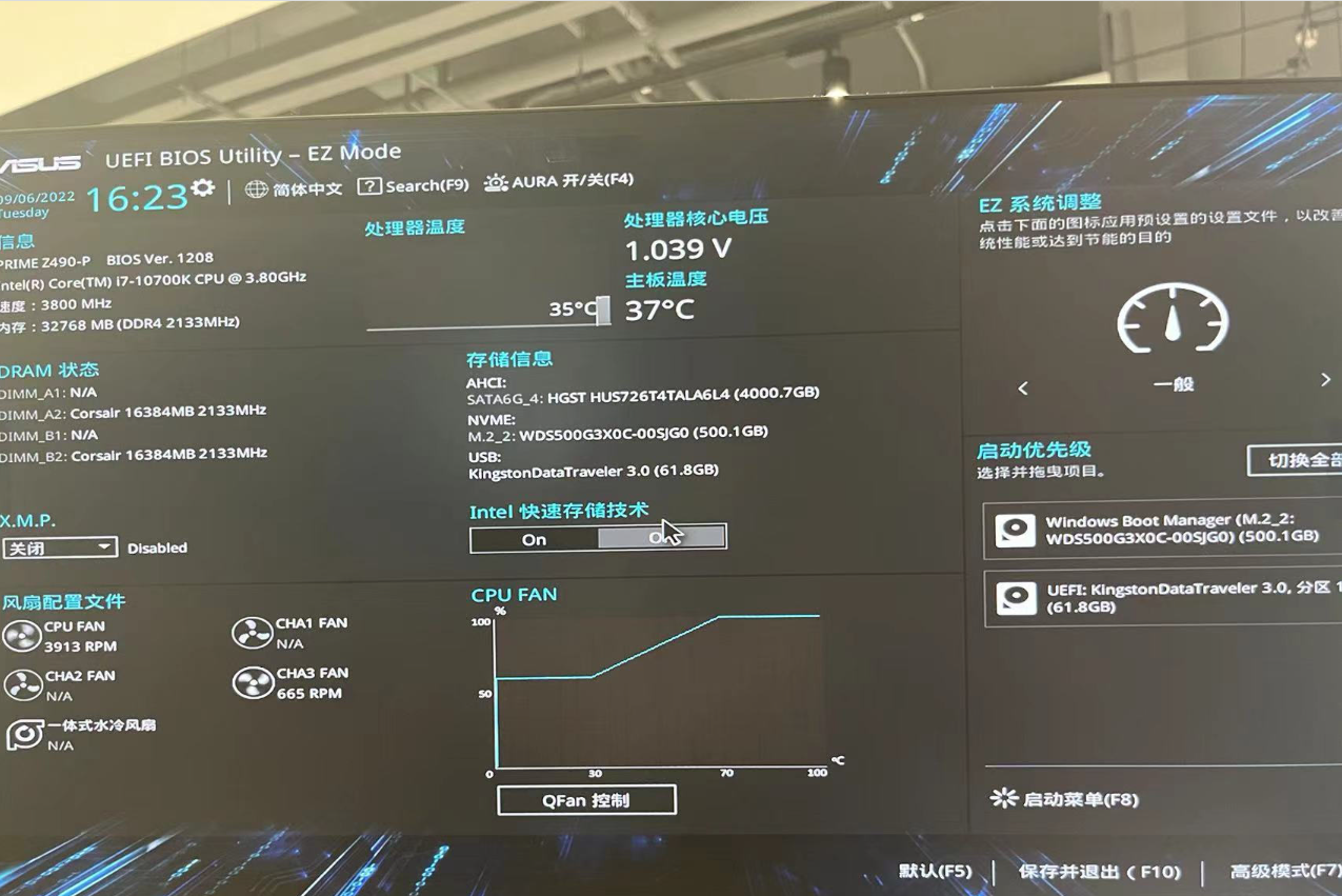 把系統盤插入電腦中,然后重啟電腦,這里需要進入bios界面更改為U盤啟動,不同品牌電腦進入bios的快捷鍵不同,華碩主板為F2。