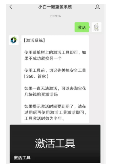 步驟一:關注“小白一鍵重裝軟件”微信公眾號,回復激活獲得激活工具。