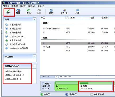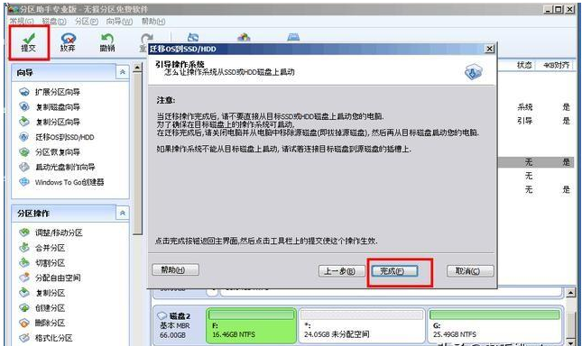 6.返回到分區助手的主界面,點擊左上角的【提交】按鈕,根據提示完成操作即可完成系統遷移。