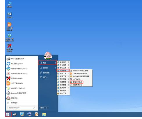 1.打開開始菜單,依次點擊【程序-磁盤管理-傲梅分區助手】。
