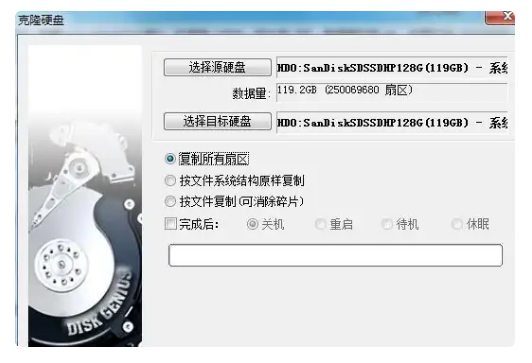 3、按照提示選擇好源盤與目標盤后選擇復制所有扇區,點擊開始,等待進度條完成。然后將新硬盤直接替換到主機上面開機即可。