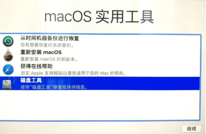 2、然后長按command+R鍵不放后,出現以下的界面,當中有 4 個選項,選擇“磁盤工具”,再“繼續”。