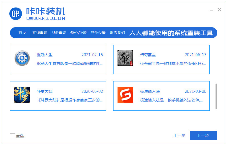 1、打開咔咔裝機工具,選擇系統進行安裝;