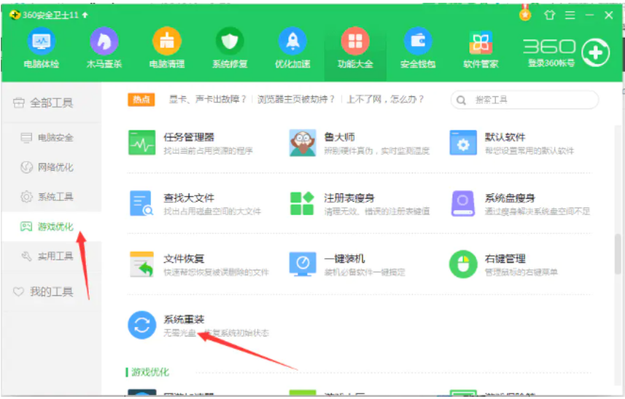 1、筆記本怎么在線重裝系統?借助某些安全軟件,如系統之家,360軟件內部都是擁有的重裝系統的功能等。或者說一些第三方一鍵重裝系統軟件的主推功能,比如小白一鍵重裝系統,裝機吧一鍵重裝系統,大白菜裝機軟件。這里以360為例,告訴大家如何重裝系統的入口,只需打開工具后即可按向導提示操作重裝系統即可。