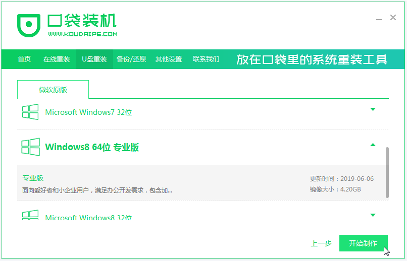 1、先在能用的電腦上安裝口袋裝機一鍵重裝系統工具并打開,插入1個8g以上的空白u盤,進入制作系統模式。