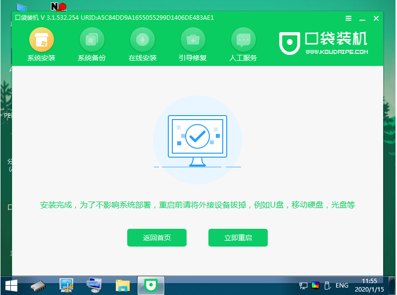 4、口袋裝機工具會自動安裝系統,安裝完成后自動重啟。