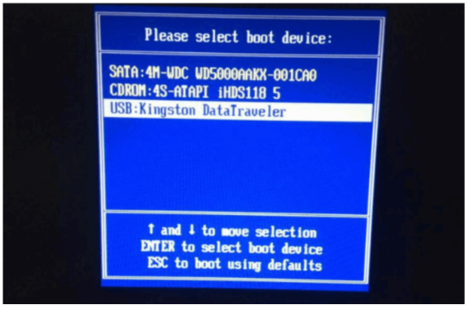 4.插入u盤啟動盤到電腦,開機時不斷按啟動熱鍵進啟動界面,選擇u盤啟動項,按回車確定進入到pe選擇界面,選擇第一項pe系統回車進入,如圖所示。