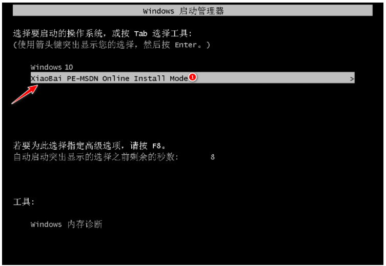 4、重啟電腦后,我們只需要選擇 XiaoBai PE-MSDN Online Install Mode,按回車鍵進入 Windows PE 系統界面即可。