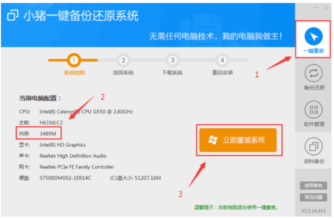 1、首先在小豬一鍵備份還原系統中,選擇右側列表中的“一鍵重裝”選項,稍等片刻后,在左側列表中就會讀出你電腦配置的具體信息。記住你電腦的內存信息后,點擊“立即重裝系統”后進入下一步操作。