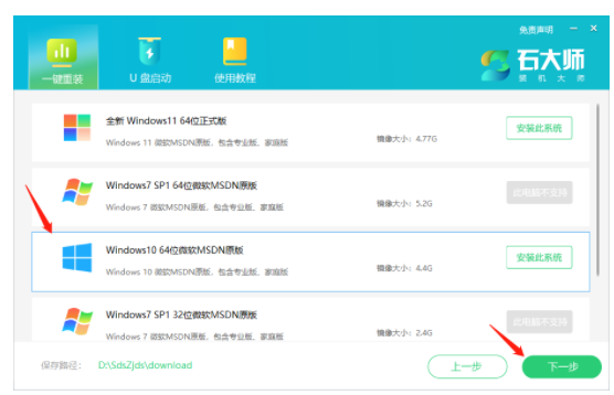 1、首先下載石大師一鍵重裝系統工具,然后點擊進入軟件界面后,可根據提示選擇安裝Windows10 64位系統。