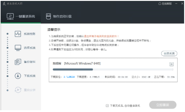 以上便是老友一鍵重裝系統教程步驟,既可以選擇在線一鍵重裝系統,也可以選擇制作u盤重裝系統,大家根據電腦實際情況選擇操作即可。另外更加好用的小白一鍵重裝系統工具,也可以了解使用哦。