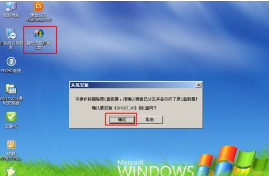 5、在完成分區后,雙擊【自動恢復xp到C盤】,然后點擊提示框中的確定。