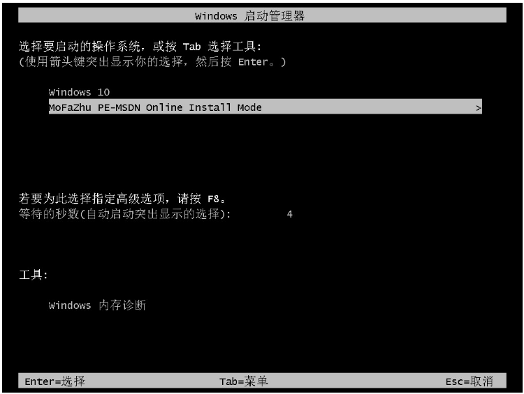 4、重啟電腦之后,選擇第二個“XiaoBai PE-MSDN Online Install Mode”按回車鍵進入pe系統即可。