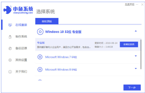 1、首先電腦上搜索并下載小魚一鍵重裝系統,打開軟件,選擇在線重裝,再選擇win10系統,安裝此系統。