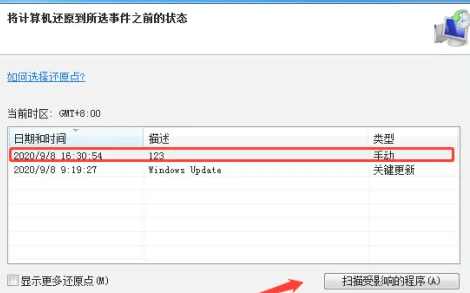 9.選擇我們最近手動設置的還原點,點擊掃描受影響程序就可以啦。