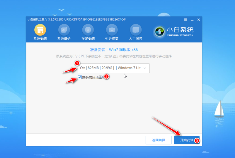 6、接著我們將系統安裝到系統盤c盤,然后點擊開始安裝即可。