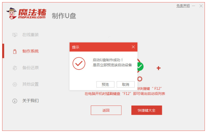 3、電腦自動開始制作u盤啟動盤,可以快速預覽需要安裝的電腦的啟動快捷鍵,然后再拔掉u盤。